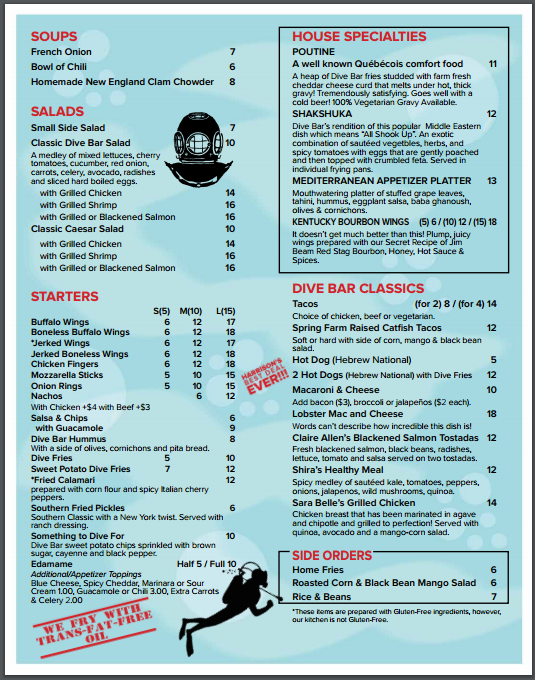 Blackened catfish fillets topped with a spicy chopped salad of carrots, daikon and various spices then topped with jalapeño peppers, cilantro, sliced cucumber, onion on a soft hero roll with dive fries and a side of sriracha mayo.