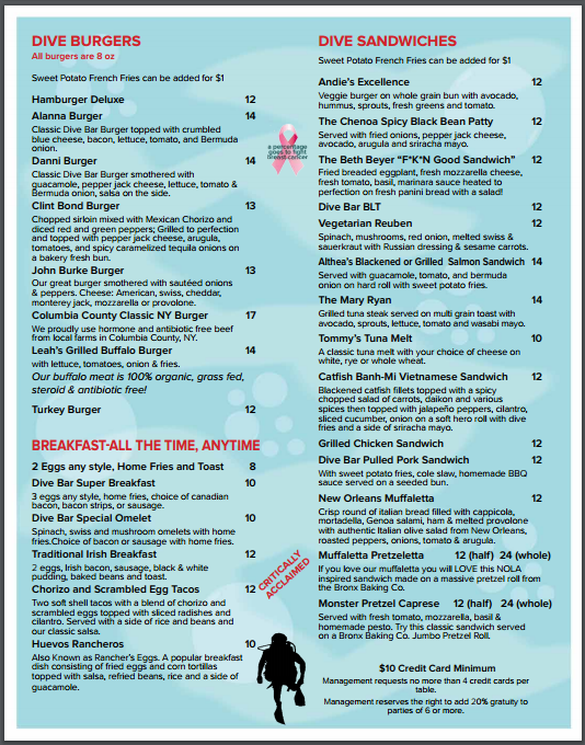 Classic dive bar burger topped with crumbled blue cheese, bacon, lettuce, tomato, and bermuda onion.